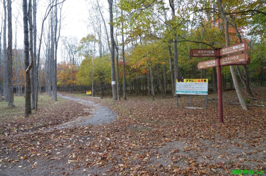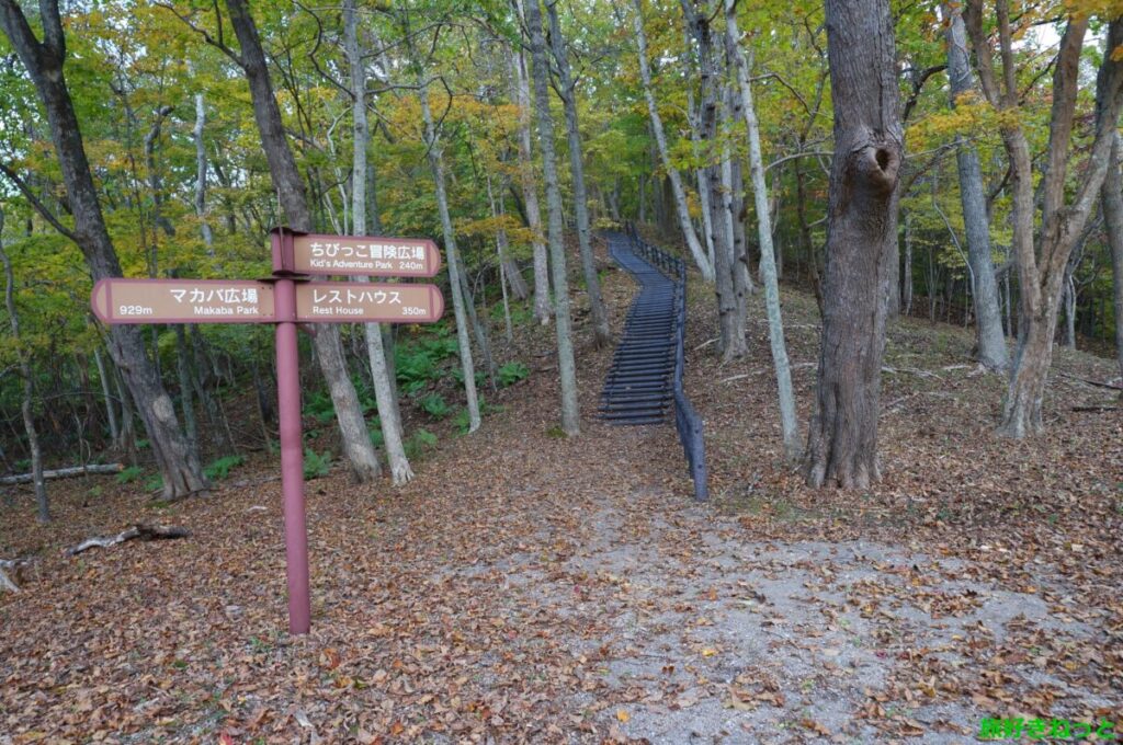 ちびっこ冒険広場:240m、レストハウス:350m、カラマツ広場:362m、マカバ広場:929mの看板があります。右側に階段があり、さらに上まで行けるようです。