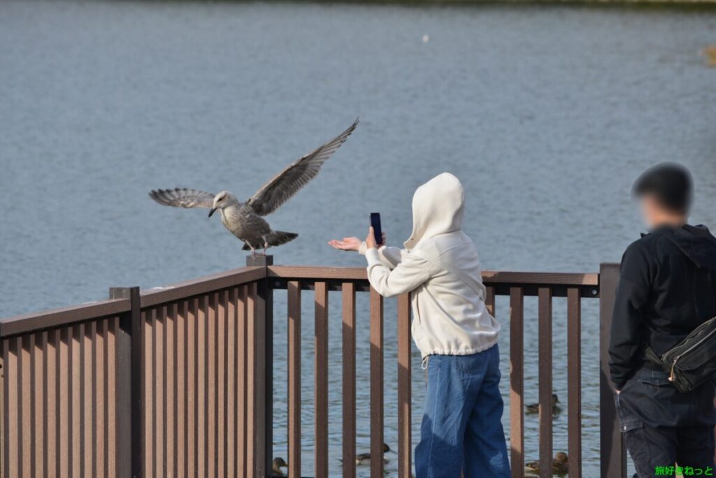 金太郎の池の観覧デッキ(柵)に止まったカモメを撮影する人