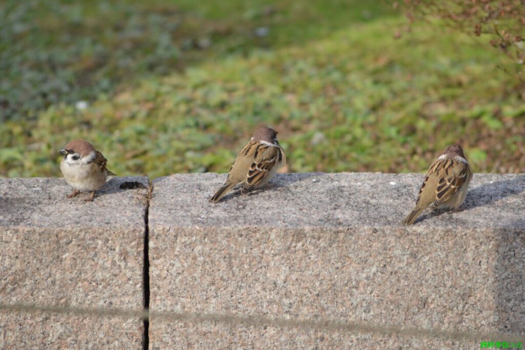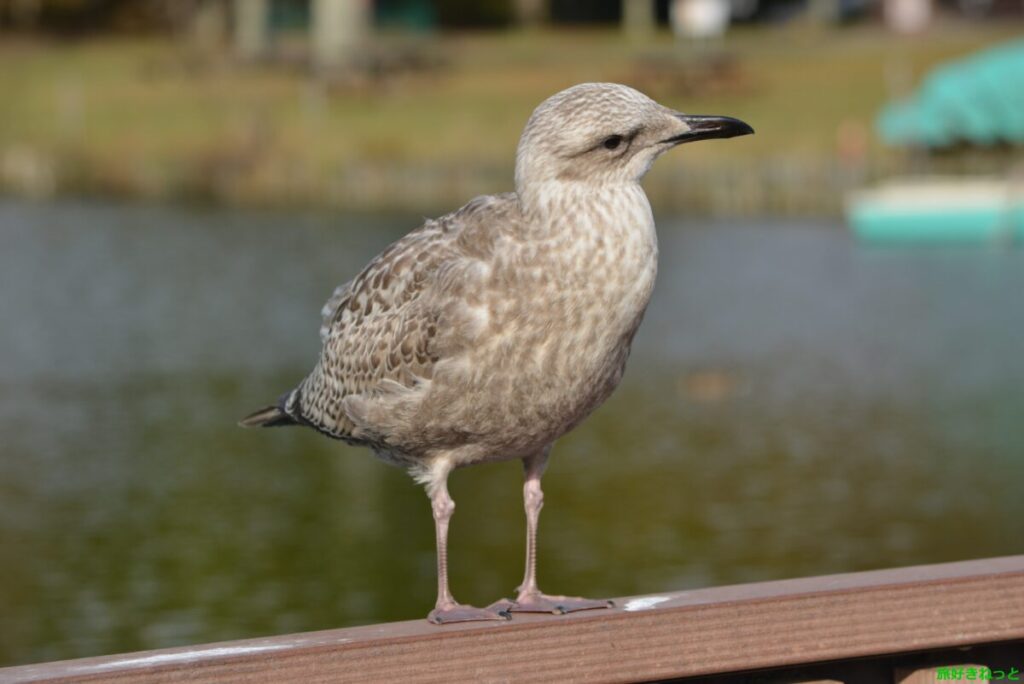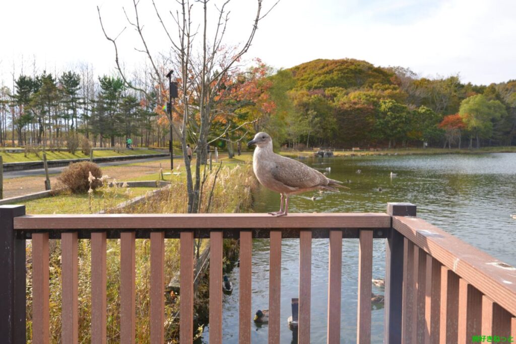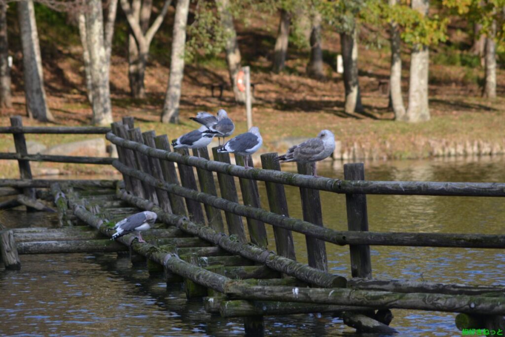 緑ヶ丘公園(金太郎の池)の柵で休憩するカモメ写真
