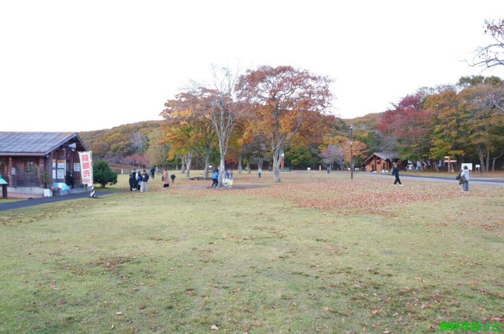 緑ヶ丘公園(金太郎の池)の広場で遊ぶ人々(紅葉時期の写真)
