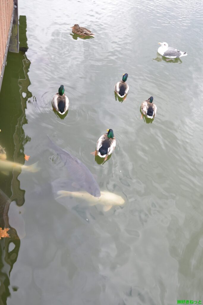 金太郎の池に張り出した観覧デッキからは、水鳥の他に鯉も観察できます。