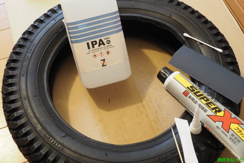 ■IPA(イソプロピルアルコール):ビード補修部分の油や汚れを落とすために使用。ゴムに使えるパーツクリーナーでも良かったが、室内でやるのでキッチンペーパーにIPA(イソプロピルアルコール)をつけて、軽く落とす程度に使用した。※IPAはゴムを傷めやすい溶剤なので、作業する場合はゴムに使えるパーツクリーナーの使用をおすすめします。