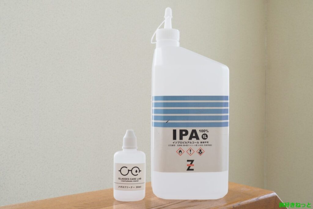 そこで、無水エタノールが入手しやすくなってから出番がなくなっていたIPA(イソプロピルアルコール)を使い、「メガネ・カメラレンズ・スマホ画面用の液体クリーナー」を自作してみました。