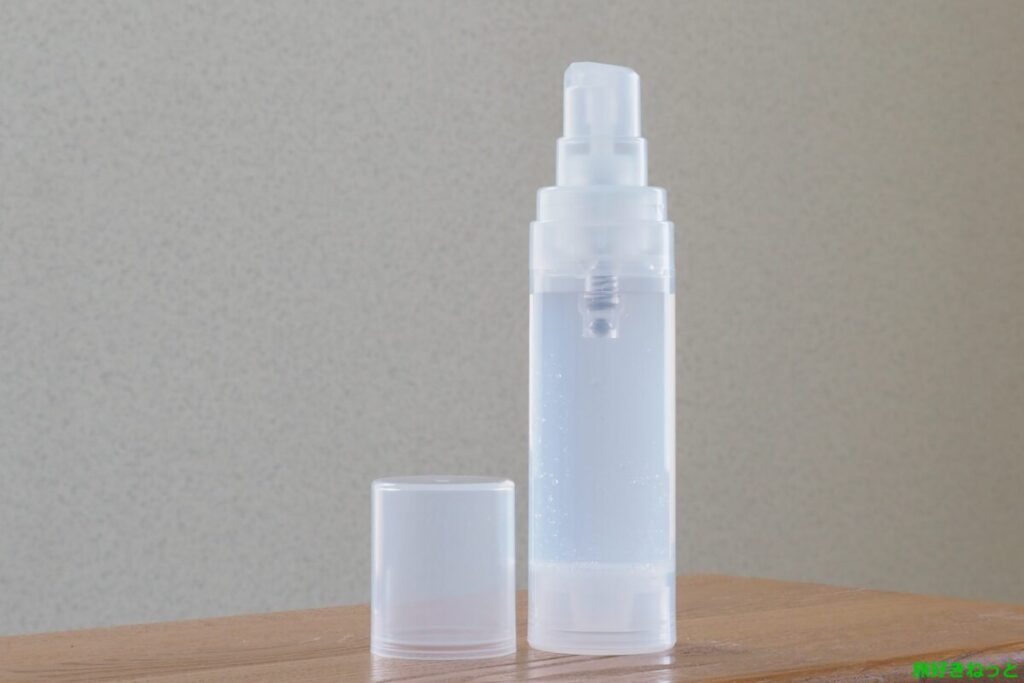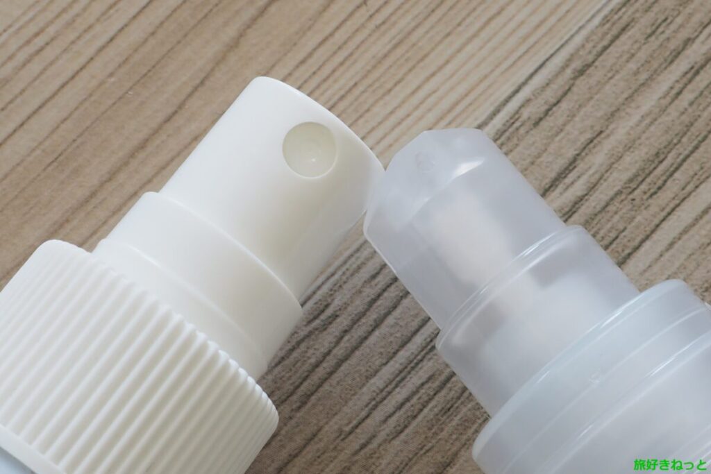 100均のボトル容器には、1プッシュで一定量が出る「真空ポンプタイプ」と霧状に広がる「スプレータイプ」があります。普段はクリーナー用途に最も一般的な「スプレータイプ」を使用していますが、「真空ポンプタイプ」はどんなものか使ってみたかった。ただそれだけの理由です。