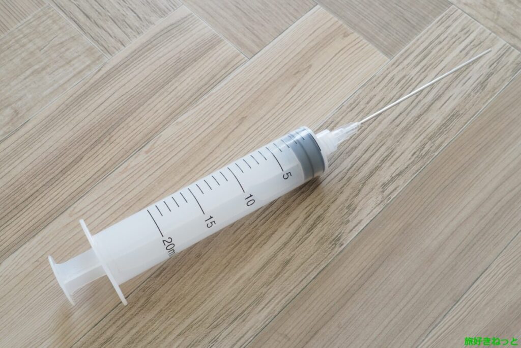目盛りの付いたスポイトは、液体の量を測るのに使いやすいです。スポイトも100均で入手可能です。