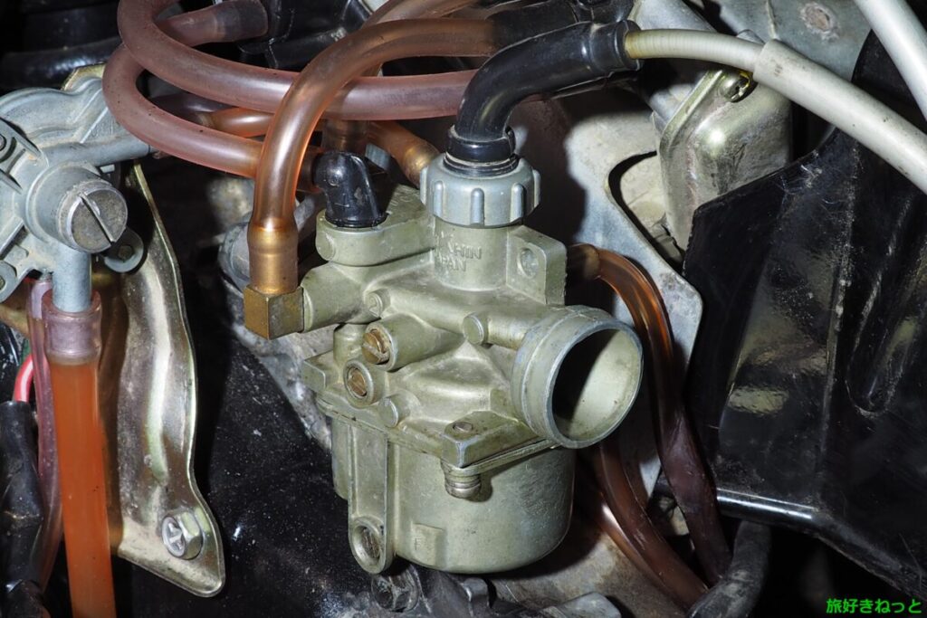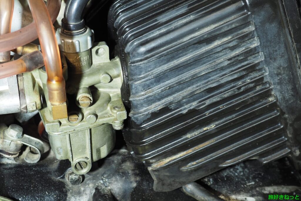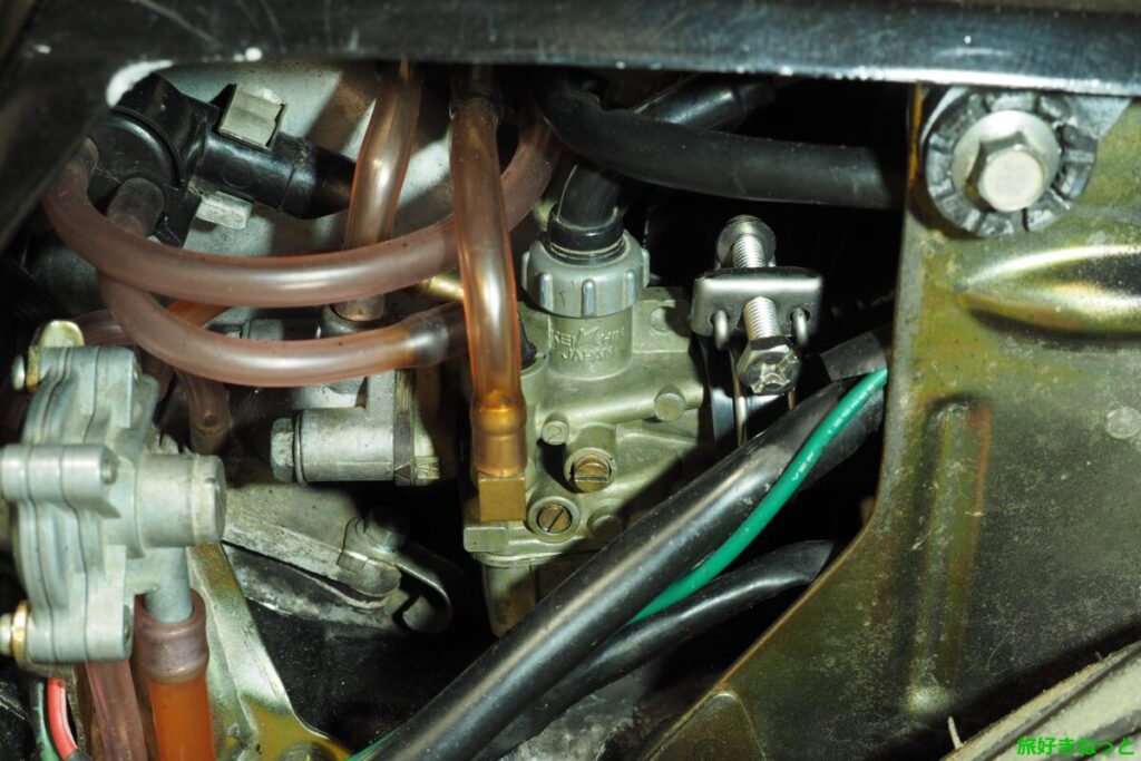 スロットルストップスクリュー(アイドリング調整ネジ)の調整もしましたが、エアスクリューを全閉から1回転と90度くらい戻すことで、車庫の坂も上れるようになり、ボコボコしている感じ?もなくなりました。