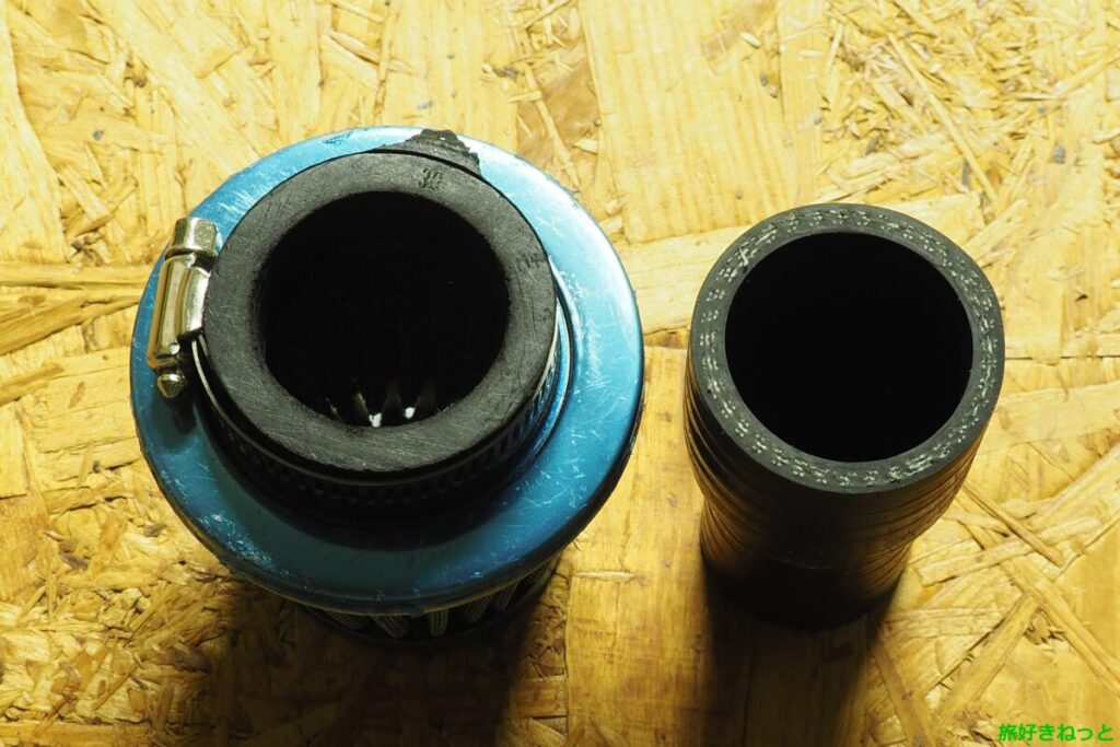 しかし、異径パイプの35mm側は、パワーフィルターと同じ口径サイズであるため入りませんでした。(無理やり入れることは可能でしたが変形してしまい、見た目も悪くエアー漏れが起きそうです)