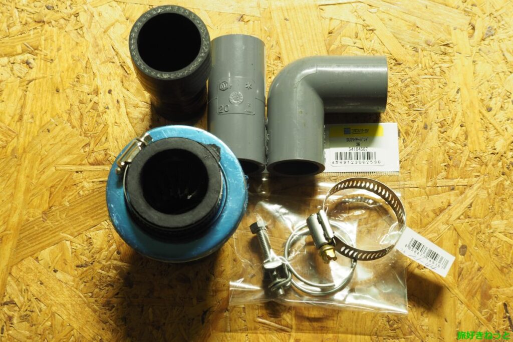 ただし、継手で繋いだだけではエアー漏れの心配があるため、ホースバンド2個をジョイフルエーケーのホームセンターで買ってきました。