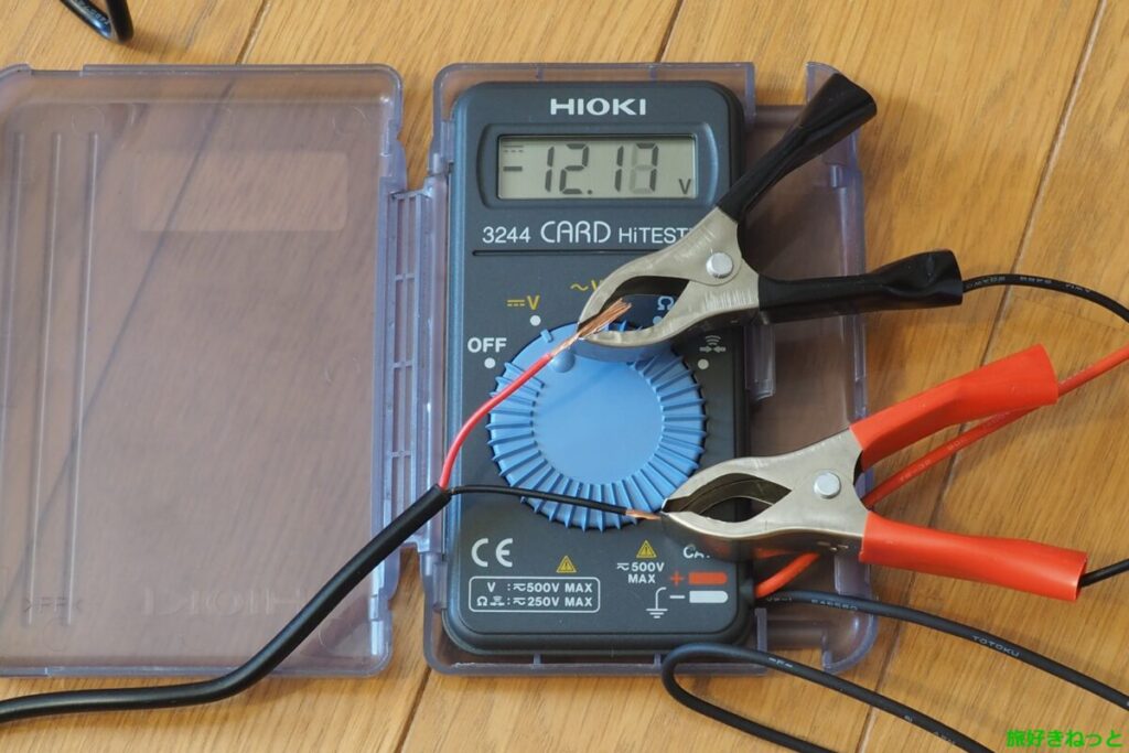HIOKI 3244のテスターの表示が「+12.17V」だったので、DC12V 3Aの代用アダプターケーブルの極性は、赤がプラス、黒がマイナスのセンタープラスで、色分けも仕様通りであることが確認できました。
