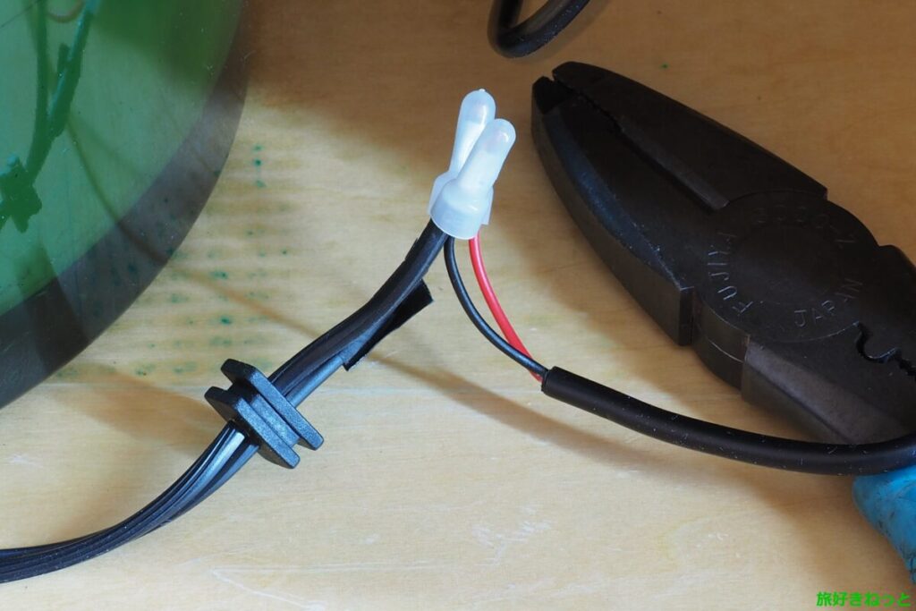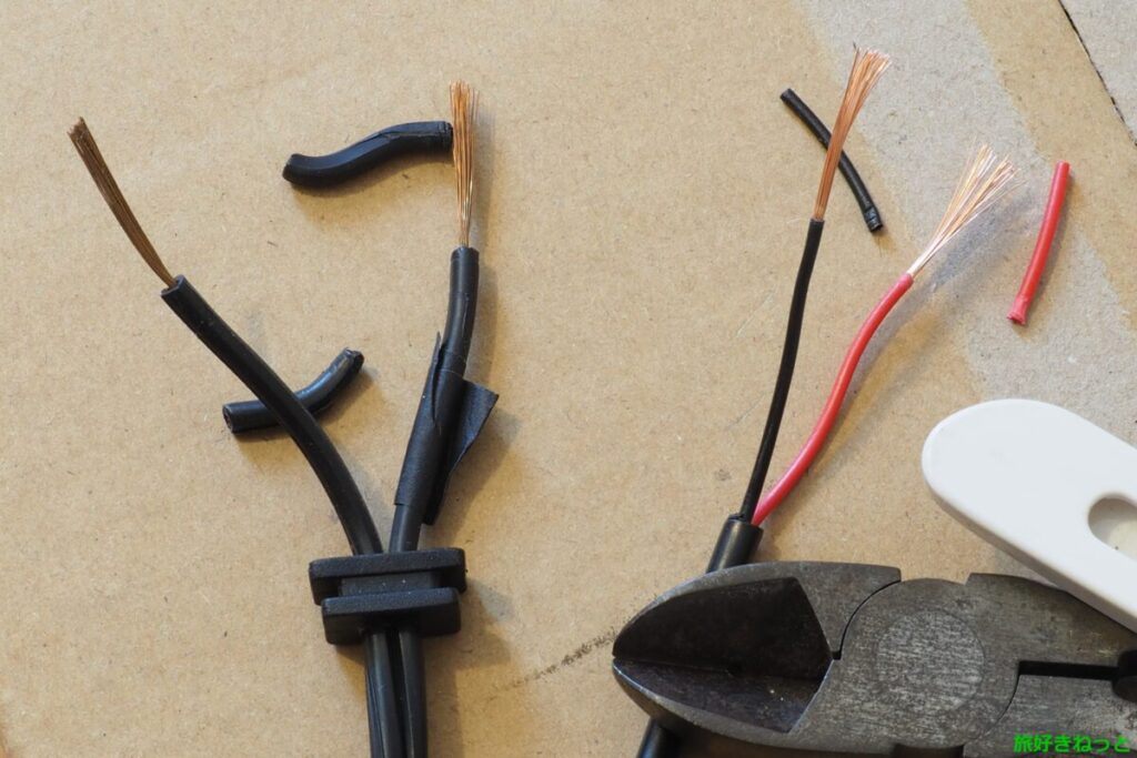 ケーブルを切断する前に、+、-が分かるように、+側にテープを貼りました。また、+側には小さく文字が入っていたので、目印としても使えました。