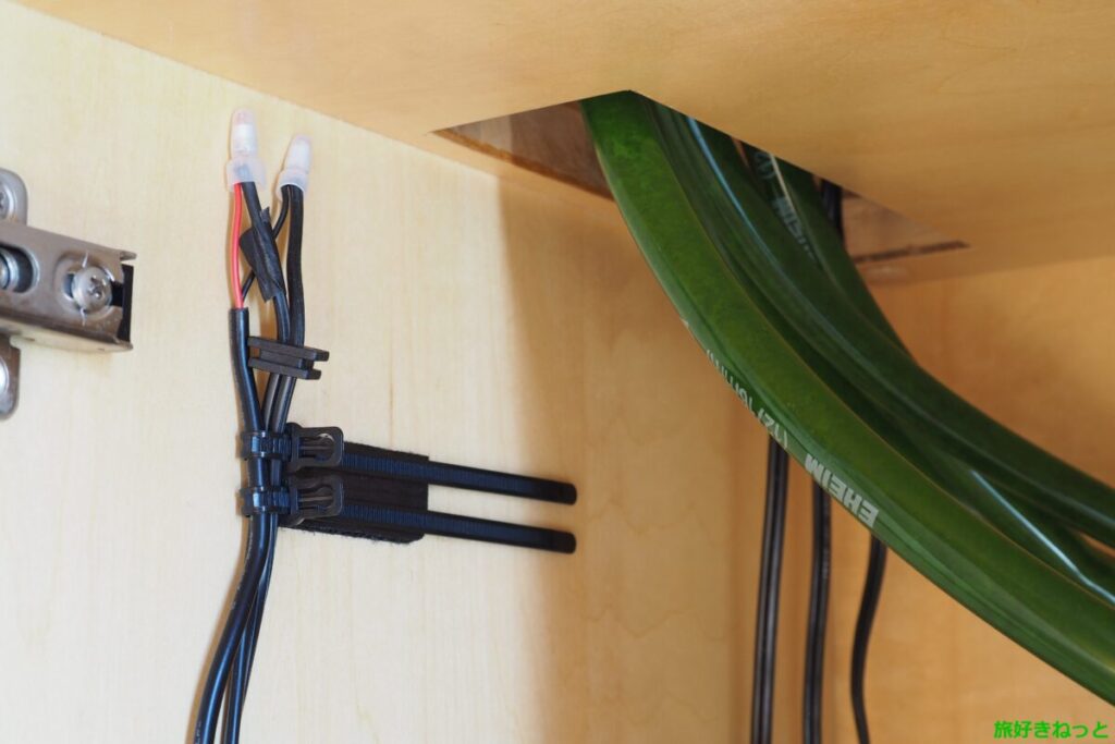 ここでは、水槽専用台の下の棚にコンセントがあり、ホースや配線用の穴にDC12V 3Aの代用アダプターが入らないため、棚の中で線を接続しています。