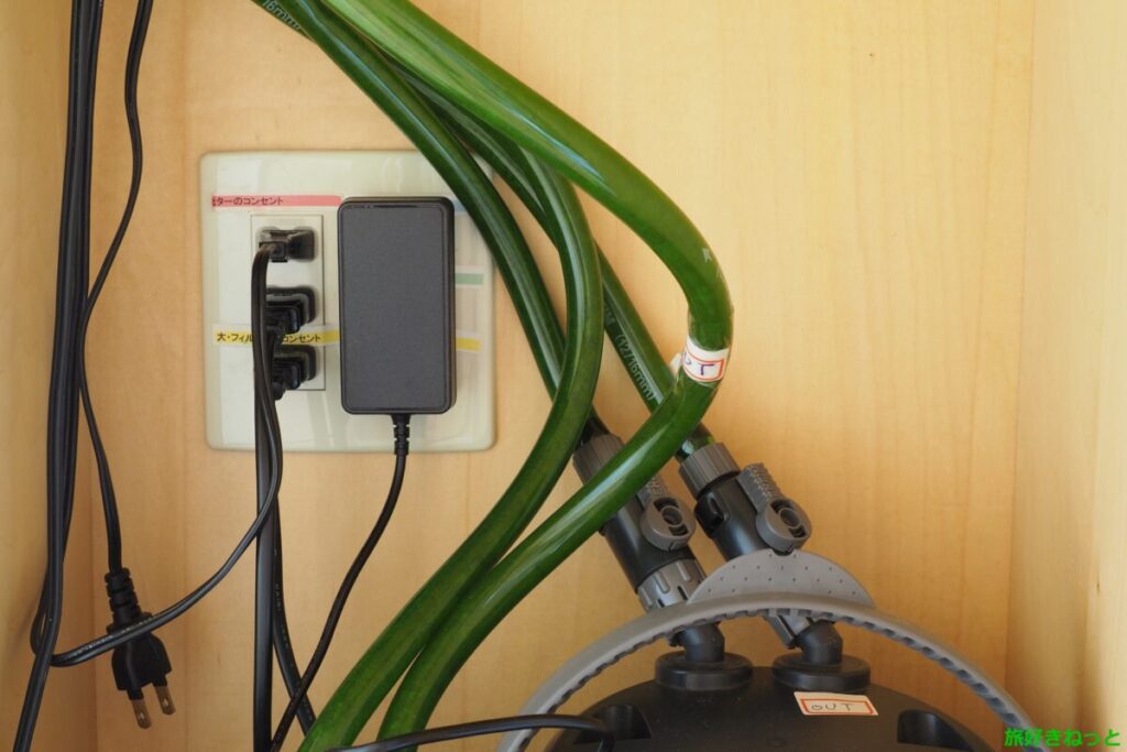 このアダプターは、PSE認証取得済み・過電流保護・過電圧保護・ショート保護付きという点でも、水槽環境での使用に向いていると思います。