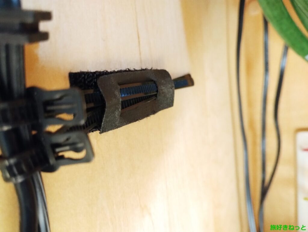 追記で、マジックテープ片側のテープ部分に、ケーブルを結束したインシュロックを貼り付けただけでは落ちてしまったので、片側のマジックテープに切り込みを入れて、その中にインシュロックを切らずに中に通して、マジックテープで貼り付けて落ちないようにしました。
