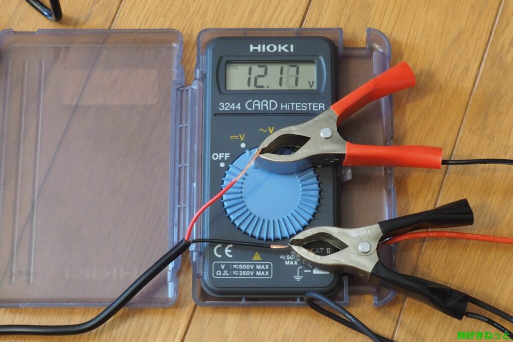 テスターの赤プローブ(+)と黒プローブ(-)を直接導線に軽く押し当てるだけでOKですが、ここでは、写真を撮影しやすいように、プローブにワニ口クリップを繋げて確認しています。