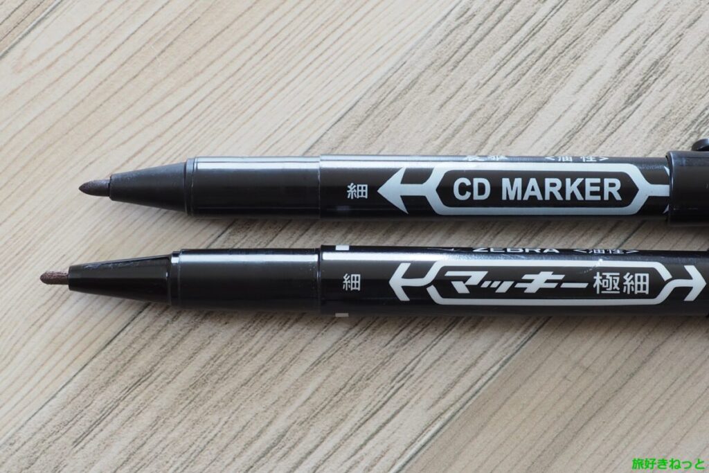 見た目の違いとしては、「ZEBIFA」には「CD MARKER」と印字されていて、ゼブラには「マッキー」と書かれている点。そしてキャップのデザインが異なる、この2点です。