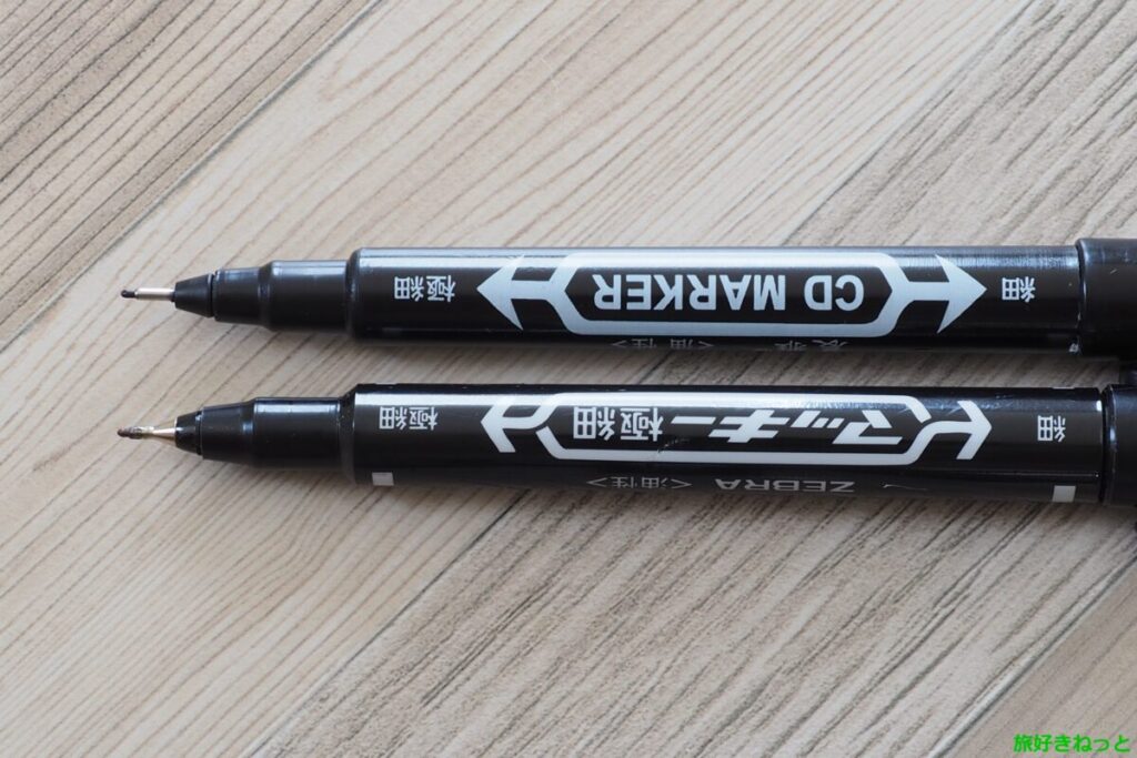 AliExpressの油性マジックペン「ZEBIFA」のペン先「細」は、筆のような形状。一方、ゼブラ(ZEBRA)マッキーの「細」は、先が丸くなっています。