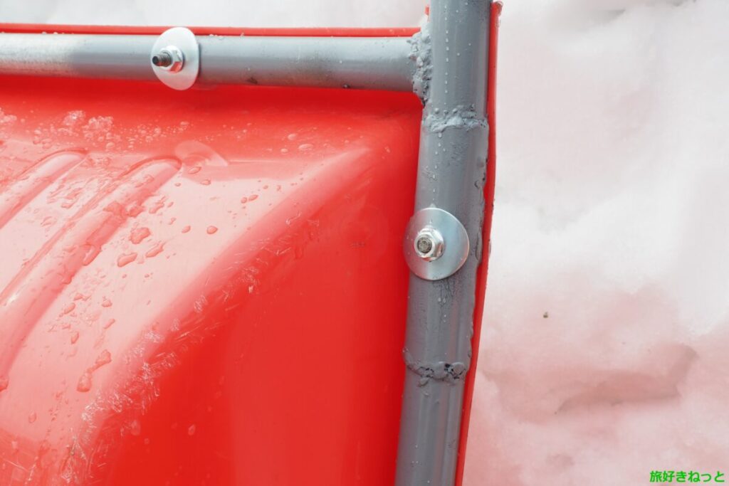 使用されていた固定金具は、ママさんダンプ(スノーダンプ)の専用ワッシャー、M6サイズのプラスネジ(ビス)、六角フランジロックナットでした。