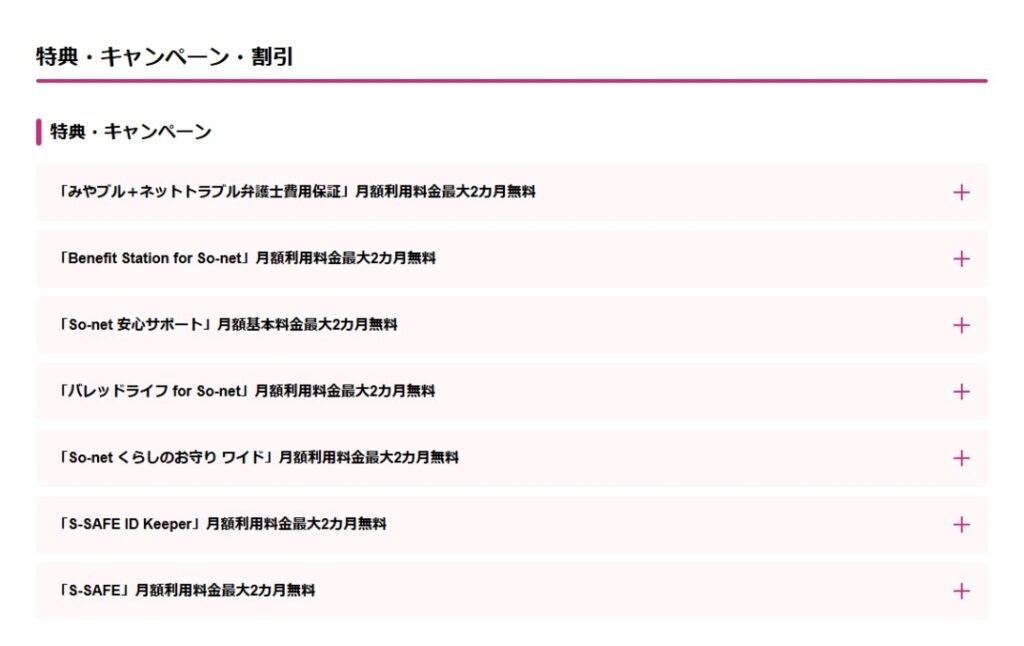 So-net(ソネット)の契約は、勧誘電話やWeb申し込みから始まることがあり、気づかないうちにオプションが付いているケースもあります。「特典・キャンペーン・割引」一覧にある2か月無料オプションは、早めに解約しておくと、あとから料金が高くなった!と困らずに済みます。