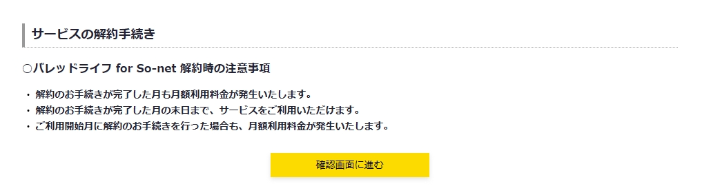 下へスクロールすると、サービスの解約手続きがありますので、「確認画面に進む」ボタンをクリックします。