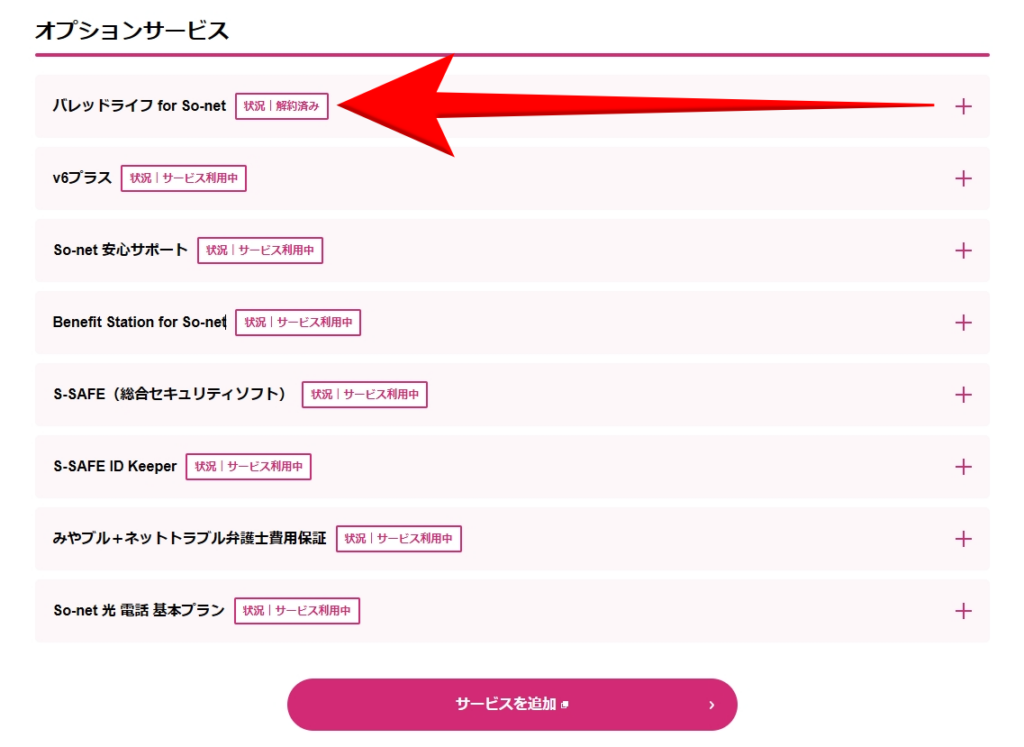 So-netオプションサービスの一覧でも、「状況|解約済み」となっています。