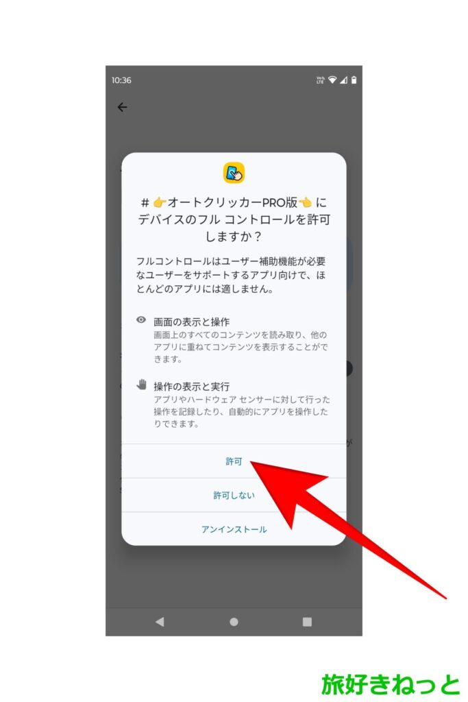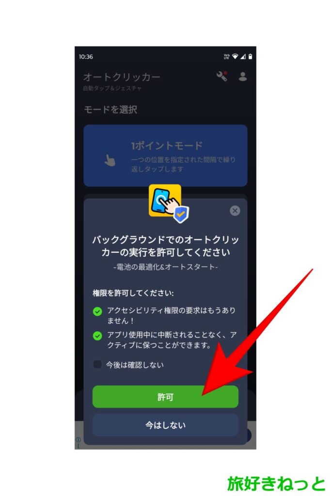 「バックグランドでのオートクリッカーの実行を許可してください」の画面になるので、「許可」をタップします。
