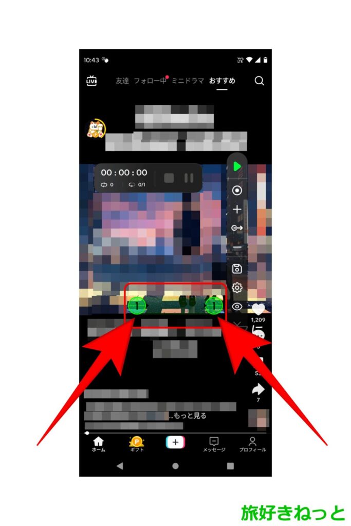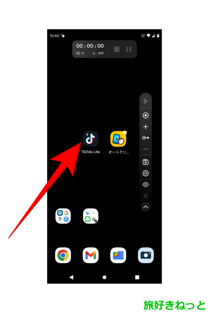 TikTok Liteのアプリを開いてもオートクリッカー(マルチポイントモード)のコントロールバーが常に上に表示されます。