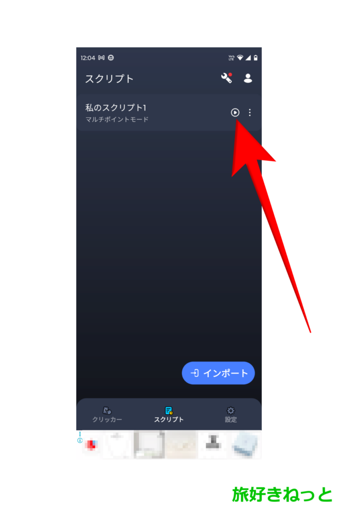 すると、先ほど作成した「私のスクリプト1」が保存されているので、再生マークのアイコンをタップします。