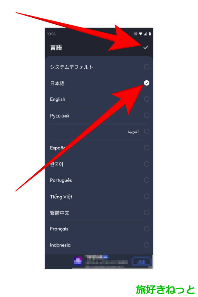 オートクリッカーの言語設定は、日本語をタップしてチェックを入れて、右上の☑マーク辺りをタップします。