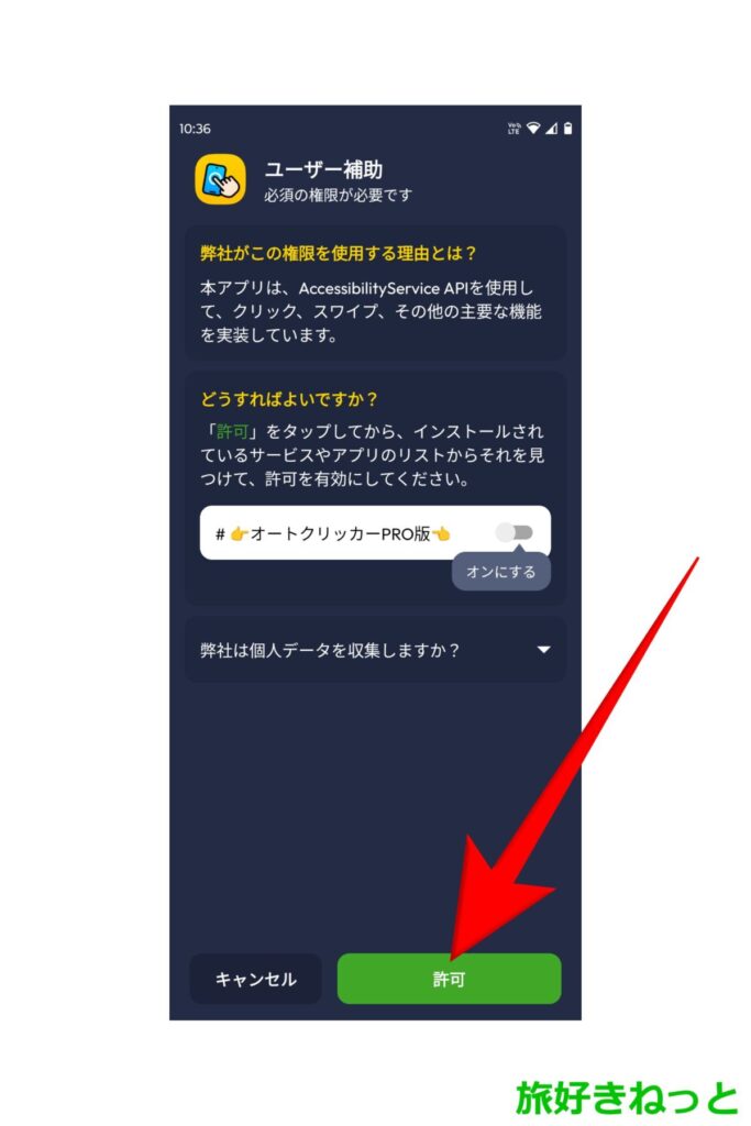 オートクリッカーはユーザー補助サービスへのアクセス許可が必要なので、「許可」をタップしてください。