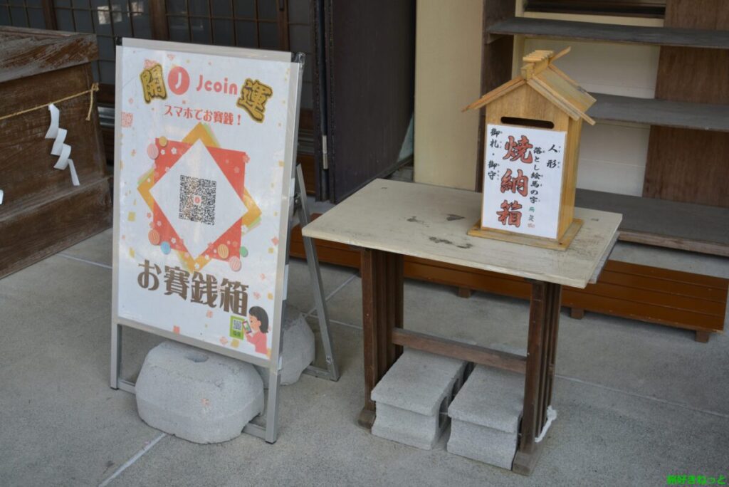 豊栄神社の拝殿には、スマホでお賽銭!のQRコードや、人形(ひとがた)落とし絵馬の字 病災 ぼけ 御札・御守の「焼納箱」がありました。